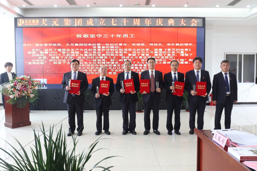 千亿官网-千亿(中国)一站式服务官网副总裁郝书明(34周年)、工程管理中心主任杨向东(34周年)、华筑通CEO韩秀海(33周年)、大元建业集团常务副总裁汤长礼(31周年)、大元建业集团总工程师郑培壮(30周年)、大元建业集团董事长/CEO王连兴(30周年)。三公司总经理郭启政为其颁奖。