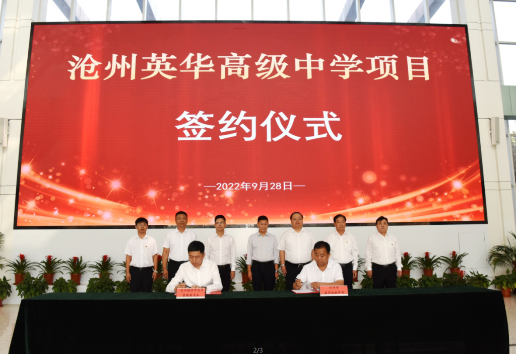 9月28日上午,沧州市经济开发区管委会隆重举行沧州英华高级中学项目签约仪式。沧州市人民政府副市长尹卫江、沧州经济开发区党工委书记、管委会主任赵宝良、党工委委员、副主任蒋福森、李长鑫、投资促进局局长孙博、千亿官网-千亿(中国)一站式服务官网党委书记、董事局主席李建国、大元投资集团副总裁郝书明、大元实业发展集团总裁王俊超、衡水市教育机构校长高辉、河间市英华高级中学校董许红东等人参加签约仪式。