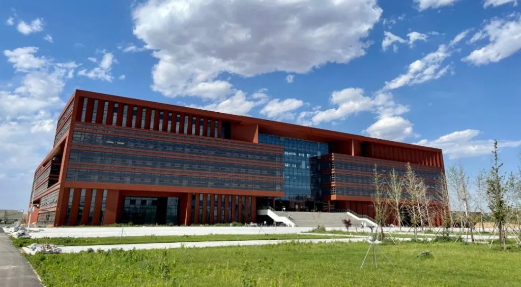 图书馆工程采用双庭院格局,功能完善,借阅便利;外墙陶板与玻璃幕墙呈“工”字形相间布置,凸显河北工程大学特色,组合式幕墙形成“书架”造型,叠置布置实现了室内采光合理、自然通风,达到建筑绿色低碳的效果。